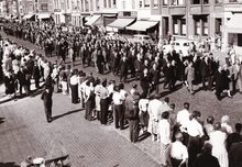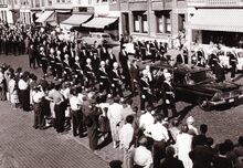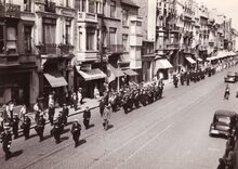 Formaat : 13 x 18 cm. - De stedelijke harmonie in de begrafenisstoet van burgemeester Henri Serruys, aan de hoek van de Alfons Pieterslaan en de Kanunnik Dr. Louis Colensstraat.