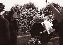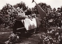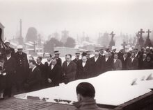 Formaat : 13 x 18 cm. - De lijkkist van burgemeester Adolphe Van Glabbeke tussen de bloemen op het kerkhof in de Stuiverstraat.L inks staat de gesluierde weduwe.