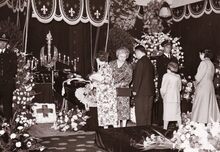 Formaat : 13 x 18 cm. - De lijkkist vanΒ Ernest VanΒ GlabbekeΒ aan het sterfhuisin de Alfons Pieterslaan 24. Het rouwbaldakijn is van Ed. David. Vooraan links naast de kist,Β met hoge hoed, burgemeester Hendri Serruys en rechts, schepen Emiel Vroome.