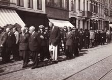 Formaat : 13 x 18 cm. - De begrafenisstoet van burgemeester Henri Serruys op de Alfons Pieterslaan, links achteraan de hoek Kanunnik Dr. Louis Colensstraat (vroeger Stockholmstraat).