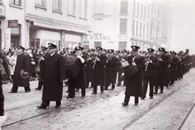 Formaat : 13 x 18 cm. - De begrafenisstoet van Ernest Van Glabbeke op de Nieuwpoortsesteenweg. Tweede van rechts vooraan loopt burgemeester Hendrik Sserruys, achter hem (met bolhoed) stadssecretaris Michel Surmont, op de tweede rij tweede van rechts commodore Georges Timmermans.