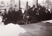 Formaat : 13 x 18 cm. - De lijkkist van burgemeester Adolphe Van Glabbeke op het kerkhof in de Stuiverstraat overdekt met bloemen en kransen.
