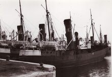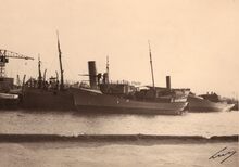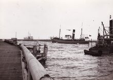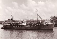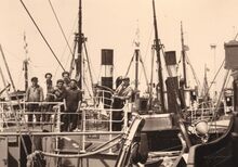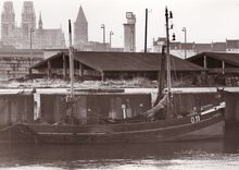 De Ijslandvaarder O.305 FranΓ§ois Musin in het Visserijdok. Rechts de ijsfabriek Froid IndustrielΒ en links ernaast de petroleummaatschappij Purfina aan de HendrikΒ Baelskaai.