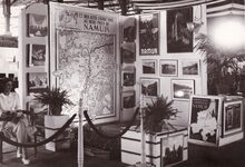 De stand van Oostende op een handelsbeurs in de hall van het oud station op het Ernest Feysplein.Rechts een (piep) jonge Arnold DEVOS, ingenieur architect hoofd van de stedelijke dienst Urbanistie met naast hem zijn echtgenote.