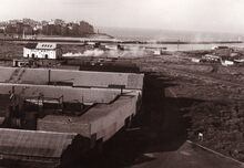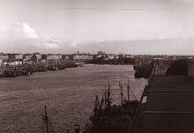 Zicht van op het dak van de Vismijn op het Visserijdok en de Hendrik Baelskaai.Β Een lichter bevoorraadt de Ijslandvaarders O.88 "Curie" en de O.92 "Graaf van Vlaanderen" van de rederij S.A. PΓͺcheries Γ Vapeur,Β met brandstof. Op de achtergrond Bredene.