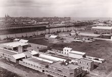 Zicht van op de watertoren aan de Dokter Eduard Moreauxlaan op de Hendrik Baelskaai en het Visserijdok.Vooraan de Jacobsenstraat.