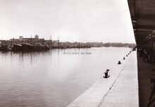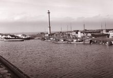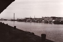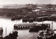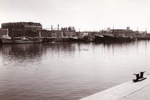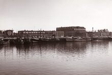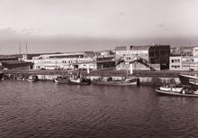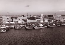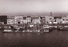 Visserijdok en Hendrik Baelskaai gezien van aan de Vismijn. Links, aangemeerd de O.231 "AndrΓ©-Monique", de ijsfabriek Froid Industriel