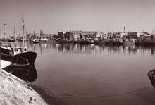 Talrijke vissersboten liggen langs de Hendrik Baelskaai. Achteraan de nieuwe vismijn in wederopbouw na de vernietiging tijdens de Tweede Wereldoorlog