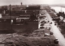 Het Visserijdok en de Hendrik Baelskaai gezien van op het dak van de Vismijn. De O.154 "Georges-Georgette" en de O.345 "Finistere" (links) laden ijs bij de Froid Industriel. Er naast de gebouwen van de rederij "Motorvisserij" en de "Ostend Stores & Rope Works", en "Purfina"