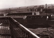 De O.287 "Ixous" in het sas bij het Visserijdok. Rechts André Vanhove. De vissers dragen klompen. Gereed om het sas binnen te varen o.a. de O.289 en O.312. Op de achtergrond de Hendrik Baelskaai met het metaalbedrijf van Valcke Frères.