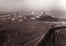 Het militair domein "Halve Maan" op de oosteroever gezien van uit de vierde vuurtoren "Lange Nelle". Een baggerschip in de havengeul.