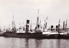 Aangemeerde vissersvaartuigenΒ (volks : visbakken) van rederij M.V. in het Visserijdok.