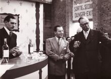 Burgemeester Hendrik SERRUYS nuttigt een glaasje aan een stand op een handelsbeurs in de hall van het oud station op het Ernest Feysplein.