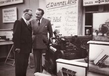 Burgemeester Hendrik SERRUYS krijgt uitleg over een motor aan de stand van garage C. Rammelaere uit de Hendrik Serruyslaan 40, op een beurs in de hall van het oud station op het Ernest Feysplein.