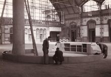 Opbouw van de stand van Oostende voor een handelsbeurs in de hall van het oud station op het Ernest Feysplein.