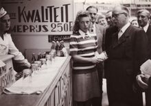 Burgemeester Hendrik SERRUYS wordt gebrieft aan een stand op een handelsbeurs in de hall van het oud station op het Ernest Feysplein.