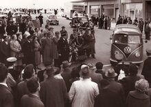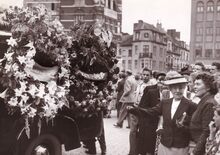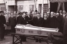 Formaat : 13 x 18 cm. - Begrafenis van Hendrik Baels,Β gewezen minister en gouverneur van West-Vlaanderen. De lijkwagen voor de Sint-Petrus- en -Pauluskerk metΒ o.a. een kroon van koning Leopold III en zijn tweede vrouw, Prinses LilianΒ Baels,Β dochter van de overledene.