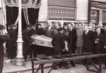 Formaat : 13 x 18 cm. - De lijkkist van Arthur Vanhoutte, Mariakerks politiek figuur, aan het sterfhuis. Uiterst rechts schepen Maurice Quaghebeur en derde van links burgemeester Adolphe Van Glabbeke. Pal naast de kist begrafenisondernemer Gaston Bourgoignie. Op de achtergrond brood- en banketbakkerij A. De Vliegher.