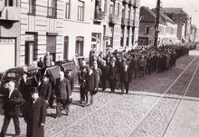 Formaat : 13 x 18 cm. - Begrafenisstoet van Arthur Vanhoutte, Mariakerks politiek figuur, op de Nieuwpoortsesteenweg bij de Aartshertogstraat. Rechts vooraan begrafenisondernemer Gaston Bourgoignie. Opmerking : er was geen lijkwagen, de kist werd gedragen.