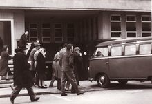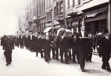 Formaat : 13 x 18 cm. - Begrafenis van Robert Elleboudt,Β uitgever van de Zeewacht. De stoet in het begin van de Kapellestraat met vooraan een piepjonge Jan Piers, de latere burgemeester en rechts van hem begrafenisondernemer Willy Lucas. Opmerking : de kist wordt gedragen.Β Achteraan rechts Cinema Cameo.