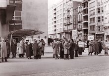 Formaat : 13 x 18cm. - Betoging van de stakende spelbedienden van het Casino- Kursaal. Hoek Albert I-Promenade met Vlaanderenstraat.