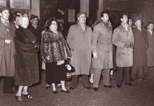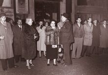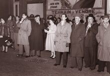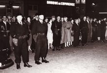 Formaat : 13 x18 cm. - Stakende spelbedienden op de Kursaal-OosthellingΒ jouwen werkwilligenΒ uit die het Β Casino-Kursaal binnenrijden. Links boven op de trap, Roger De RamΓ©e, directeur van het Casino-Kursaal.