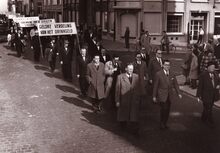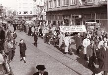 Format : 13 x 18 cm. - Betoging van stakende spelbedienden van het Casino- Kursaal in de Van Iseghemlaan. Betogende vrouwen van de stakers. Zij dragen een bord met de tekst Β :"Wij vrouwen staan naaast onze mannen in hun rechtvaardige strijd"