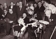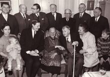 Formaat : 13x 18 cm. - Een honderdjarige en burgemeester Jan Piers. Uiterst links schepen Jan FELIX achter hem Jozef-Marie Porta, John Hermans en Theo Dehaene.