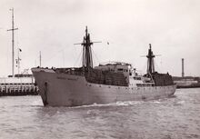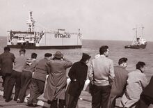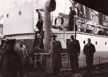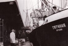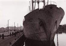 HetΒ vrachtschipΒ "Gatchina".Β Op de kade, centraal, schepen Maurice QUAGHEBEUR met naast hem, rechts,Β AlfredΒ RIGAUX, later directeur toerisme.