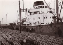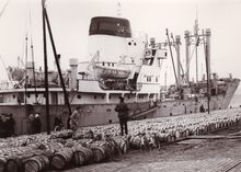 Het vrachtschip "Gatchina" wordt geladen aan de Vismijn met tonnen ingelegde vis.
