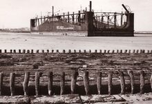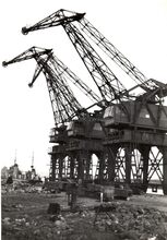 Er wordt gebaggerd in de havengeul.Op de voorgrond links haalt een hijskraan resten van een wrak op (de Vindictive ?).