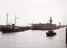 De O.319 "Noordende II" in het Vlotdok tijdens een proefvaart. De vrouwen van de bemanning staan op de brug. Links het gebouw van de Havenkapiteinsdienst.
