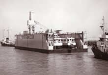 Het droogdok van OTRACO op sleep door de Nederlandse hoogzeesleepbootΒ "Oostzee" ,vertrekt naar Boma in Belgisch Congo.