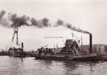 Een baggermolen in de havengeul er achter ligt een drijvende hijskraan (of heimachine).