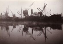 Schepen van de Britse en onze Zeemacht gemeerd aan de Cockerillkaai.