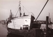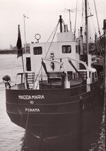 Het radio en tv piratenschip Magda Maria aangemeerd in het Vlotdok. Op de achtergrond, de kolenhandel van G. Van Emmerik n.v., hangar 6. Begin de zestiger jaren zond Radio Nord (Zweedse piratenzender) uit vanop de Magda Maria gelegen voor de Zweedse kust nabij Stockholm.