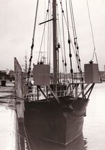 Het radiopiratenschip "Magda Maria" aangemeerd op het einde van deΒ haven. Zie ook inventarisnummer 2014/1323