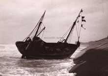 Een gestrande vissersboot tegen de dijk te Raversijde.