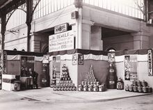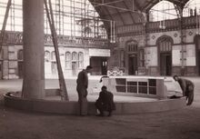 Formaat : 13 x 18 cm. - Opbouw van de stand van Oostende voor dehandelsbeurs in de Albert hall van het oud station op het Ernest Feysplein.
