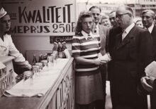 Formaat : 13 x 18 cm. - Burgemeester Hendrik Serruys nuttigt een glaasje aan een stand op de handelsbeurs in de Albert hall van het oud station op het Ernest Feysplein.