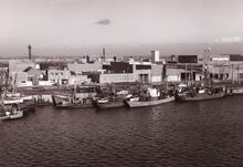 Formaat : 13 x 18 cm. - Het Visserijdok en de Hendrik Baelskaai gezien van op het dak van de Vismijn. De O.154 Georges-Georgette en de O.345 Finistere (links) laden ijs bij de Froid Industriel. Er naast de gebouwen van de rederij Motorvisserij en de Ostend Stores & Rope Works" en Purfina