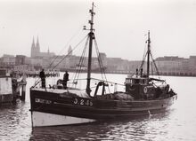 Formaat : 18 x 13 cm. - Het Duitse onderzoeksschip Anton Dohrn, op officieel bezoek, in het Visserijdok bij de Vismijn. Het bevel werd gevoerd door kapitein Ernst Vogel. De bemanning werd ontvangenΒ op het stadhuis (Gerechtshof) door schepenen Jan Piers en Kamiel Dehouck.