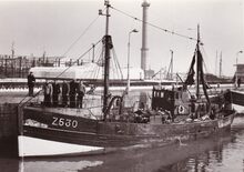Formaat : 13 x 18 cm. - Het Zeebrugse vissersvaartuigΒ Z.530 FrankΒ in het sas vanΒ het Visserijdok. De Z.530 Frank was een houten motortreiler gebouwd in 1928 op de scheepswerf van Jules Denye. Het bleef in de vaart tot 1965.Β