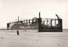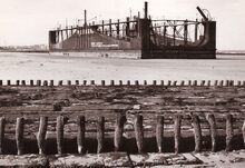 Formaat : 13 x 18 cm. - Tijdens een hevige voorjaarsstorm strandde het droogdok van de firma Philip & Son op het strand te Bredene. Het droogdok was niet meer vlot te krijgen en men besloot het ter plaatse af te breken.