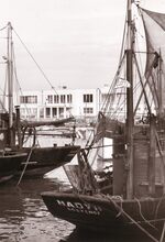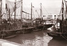 De gloednieuweΒ Garnaalmijn aan de Visserskaai. De rails van de stadstram liggen nog steeds in het wegdek. VissersvaartuigenΒ gemeerdΒ in het Montgomerydok