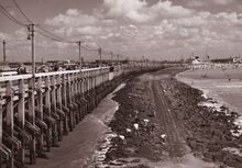 Het Weststaketsel en de naastliggende strekdamΒ "de Bas",Β bij laag water. Rechts, het Klein Strand