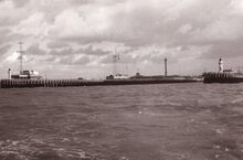 De havengeul van Oostende vanuit zee,links het Oosterstaketsel met de tijseinpost rechts de Westelijke tegenhanger.