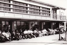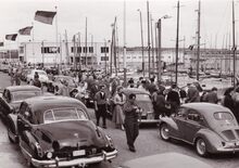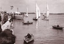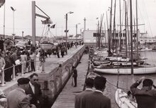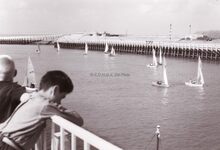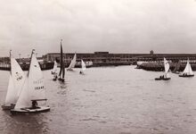 Veel bekijks vanop het Weststaketsel voor de zeilbootjes die deelnemen aan een wedstrijd. Aan de overkant rechts, de werkhuizen van het Bestuur van het Zeewezen.