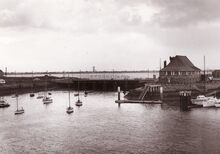 Zicht van op het terras van het N.S.Y.C. gebouw,de havengeul met binnenlopende bootjes na een zeilwedstrijd.Aan de overkant een stevige bunker uit de tweede wereldoorlog aan het begin van het Oosterstaketsel (rechtsnog een tweede).