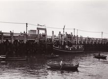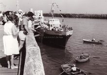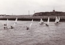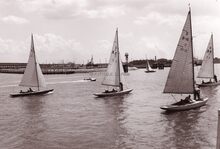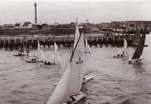 Deelnemers aan een zeilwedstrijd lopen terug de haven binnen. De" Franlis I" een boot waarmee zeetochtjes werden gemaakt ligt aangemeerd aan het Weststaketsel. Op de voorgrond drie bootjesroeiers, meestalΒ gewezen vissers, die de mensen overzetten naar de andere kant van de havengeul.